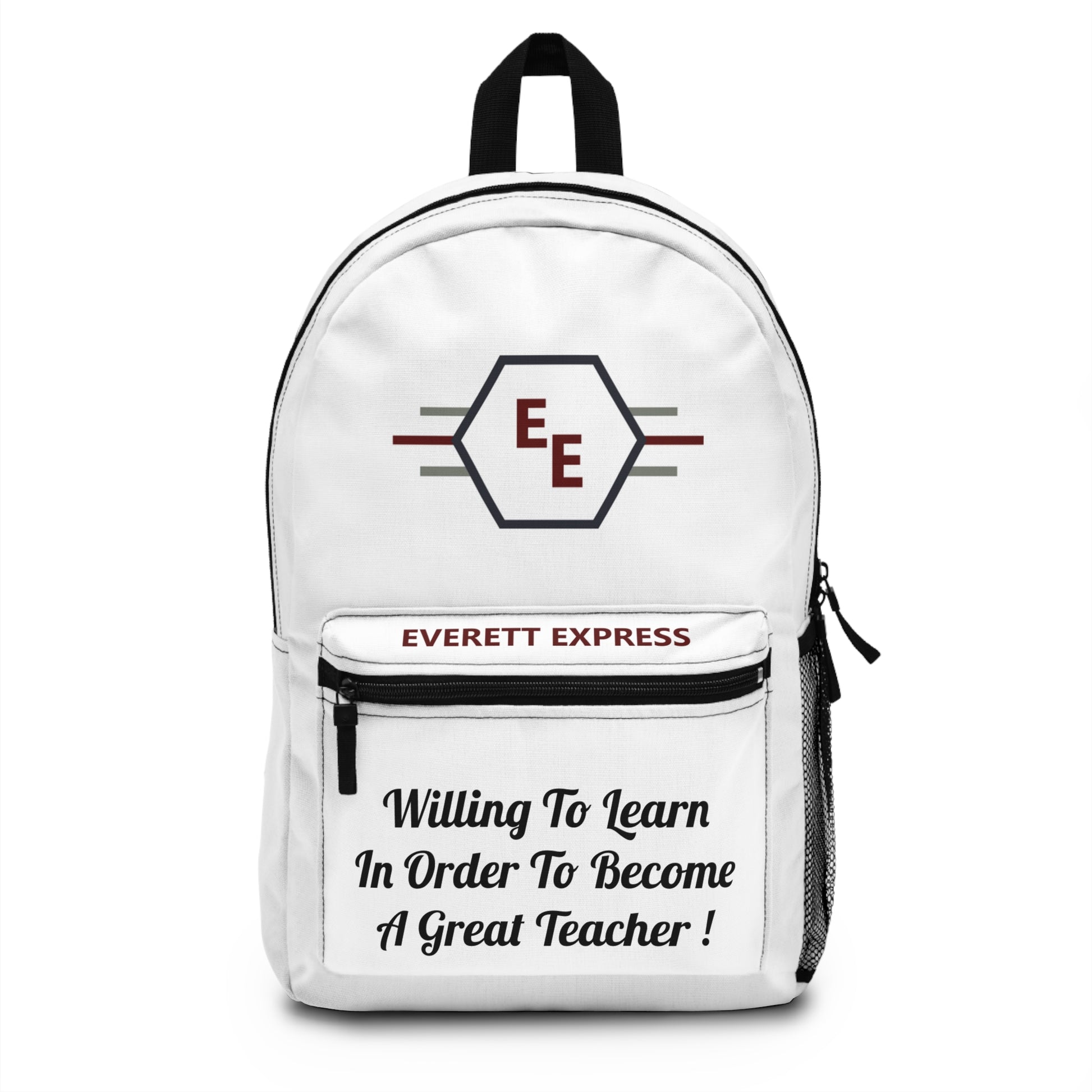 Willing to Learn In Order To Become A Great Teacher ! (Positive Affirmation) design on backpack with EVERETT EXPRESS (EE logo). This bag is made from spun polyester and weights 1.3 lbs, just enough to be light, strong and long-lasting. Grab it, stow it, throw it onto the seat next to you, this backpack can take it wherever you go!
