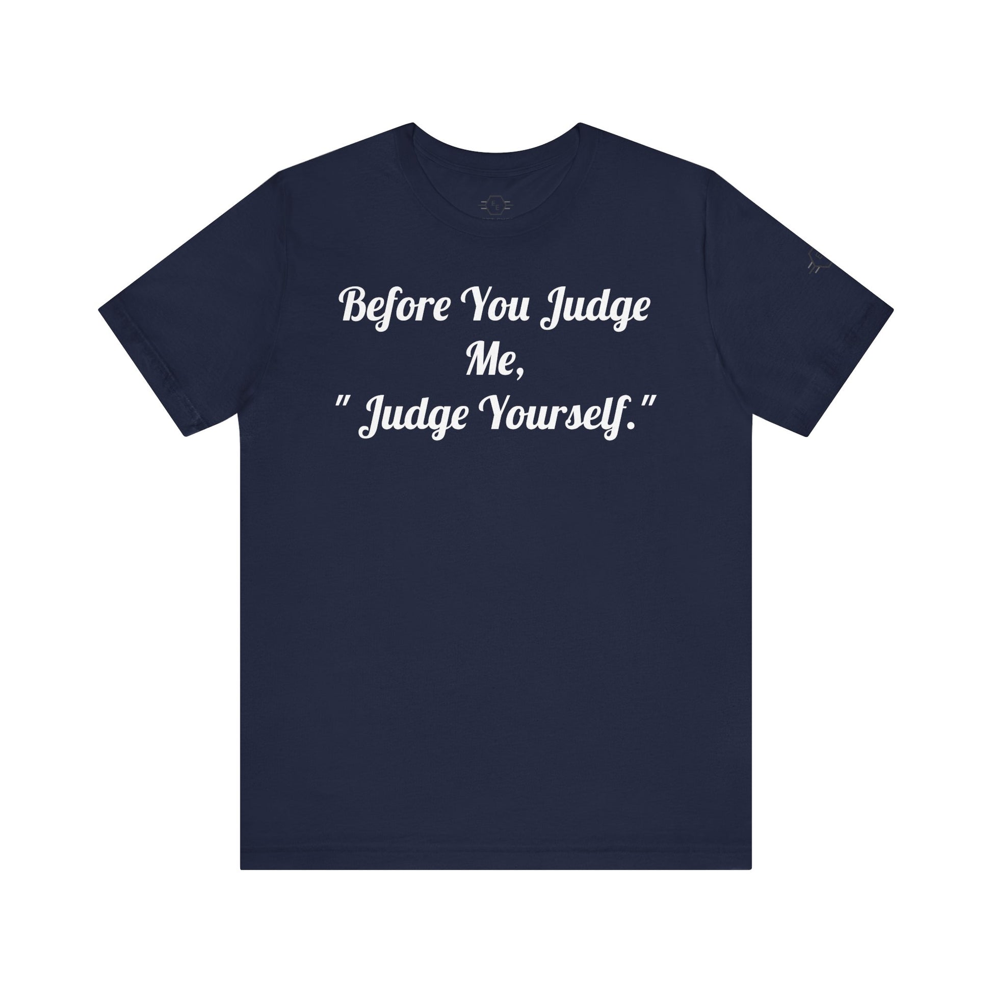 Before You Judge Me, " Judge Yourself. " design with the (EE logo) on the left sleeve along with EVERETT EXPRES-inner neck label. This short sleeve tee fits like a well-loved favorite. These t-shirts have-ribbed knit collars to bolster shaping. Dual side seams hold the garment's shape for longer.